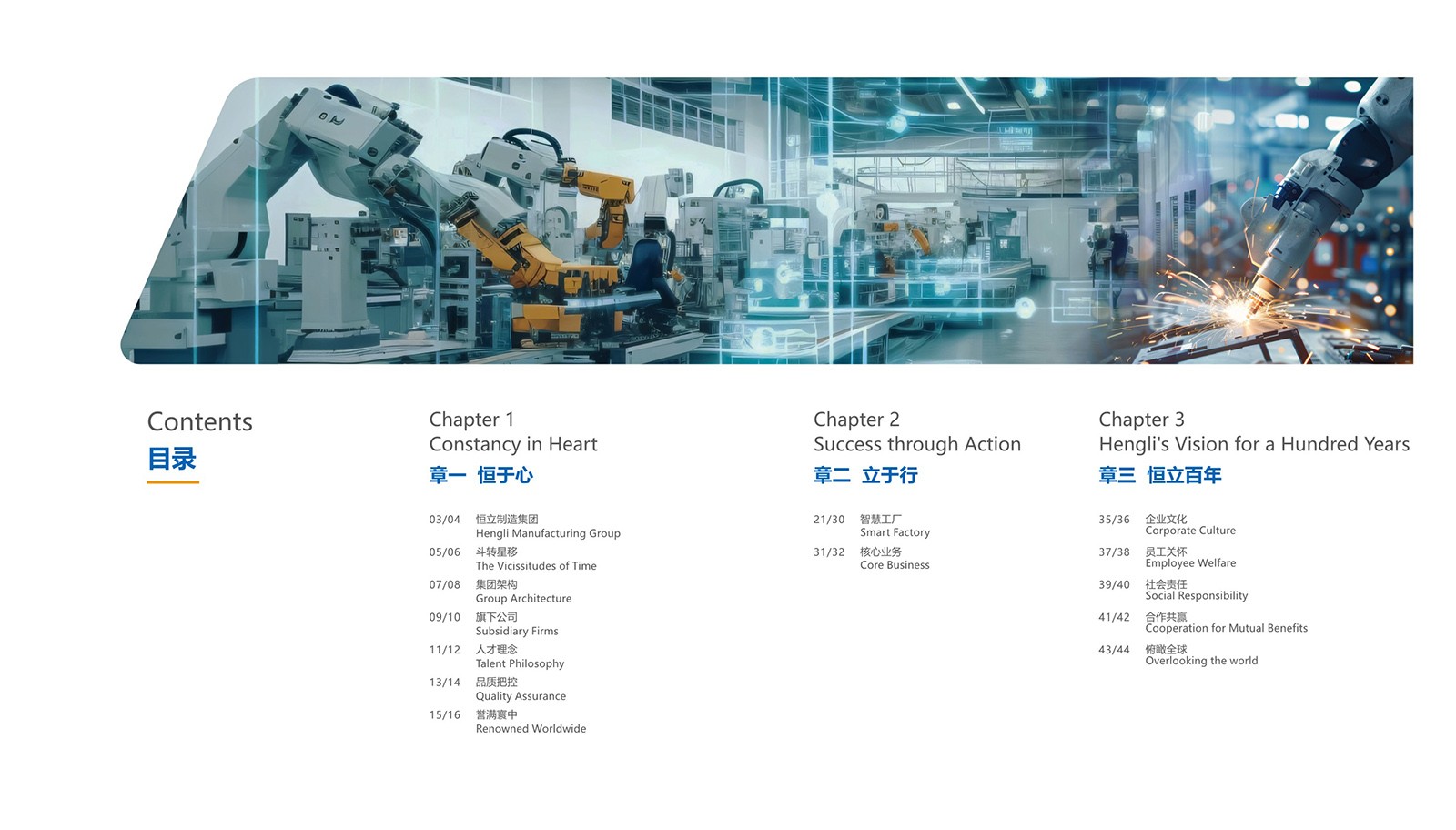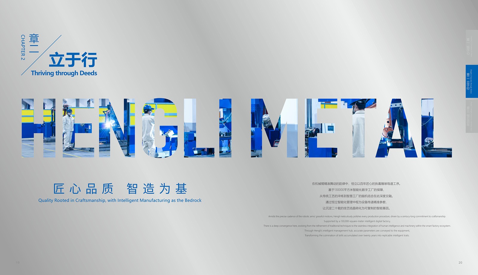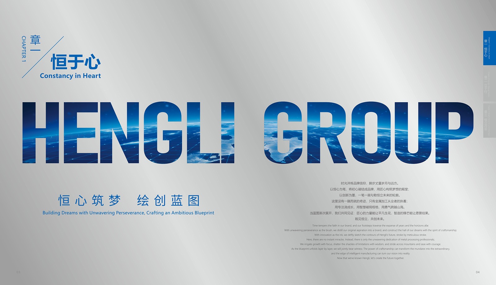 依據(jù)恒立的品牌色“恒立藍(lán)”為主色,加入印金和銀來體現(xiàn)金屬制造行業(yè)特色,采用科技感十足的設(shè)計,以科技藍(lán)與未來銀為主色調(diào),搭配簡潔大氣的排版風(fēng)格,使畫冊契合行業(yè)特點。